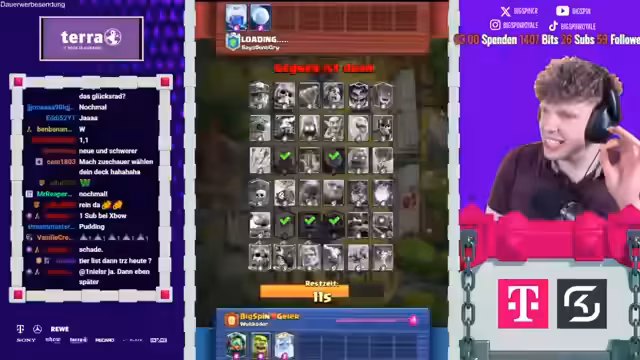 00:55:46Bei einem Gegner namens Twitch Rockets wird der Draft zunehmend schwierig. Die vorherrschenden Royal Hawks des Gegners zwingen in eine Sackgasse, die nur mit suboptimalen Karten wie dem Mini-Pekka-Mönch oder einem zufälligen Golden Knight begegnet werden werden. Trotzdem wird das knapp geholte Spiel als 'geiler Win' gefeiert.