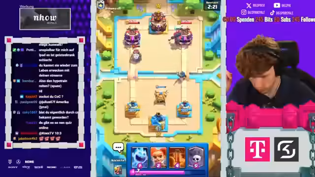 02:00:03Nach Abschluss der Hauptchallenge wechselt der Streamer zur Grand Challenge. Hier beginnt er ein neues Game gegen einen Gegner und setzt auf einen langsameren, defensiven Ansatz mit Karten wie Ofen, Ritter und Eismagier. Es gelingt ihm, soliden Schaden am Turm zu erzielen und das Spiel zu kontrollieren, indem er seine defensive Deckstärke ausspielt und den Gegner unter Druck setzt.