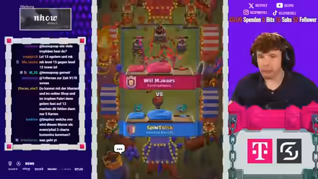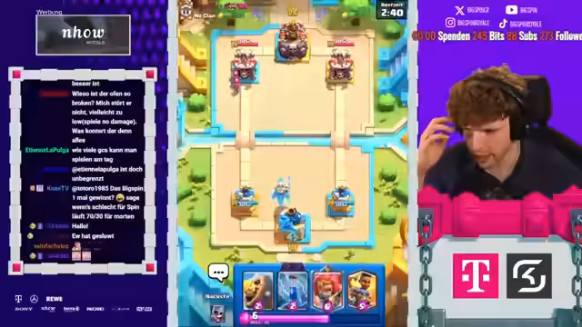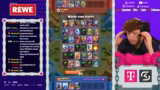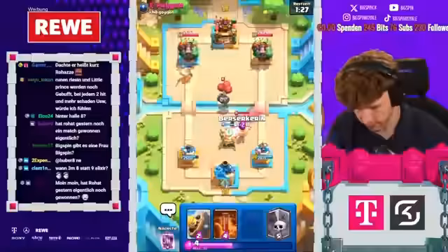 01:49:12Bei der nächsten Challenge zeigt sich der Streamer frustriert über die scheinbar unfaire Kartenverteilung. Während der Gegner ein starkes Deck mit Royal Hawks, Goblin Barrel und Kanonenkarre erhält, sieht er selbst nur schwache Karten wie Skelett-König und Schweinereiter. Er beschwert sich über den Algorithmus und den Mangel an guten Gegenkarten, was ihn zu einem harten Kampf zwingt.