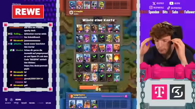 00:47:03Der Streamer beginnt nun mit der Mega-Auswahl-Challenge auf seinem Free2Play Plus Pass Account. Das besondere Regelwerk besteht darin, dass er in den Spielen keine Karten selbst wählen darf. Stattdessen überlässt er die Kartenwahl komplett dem Zufall von Supercell und versucht, diese Herausforderung zu bestehen, was zu einem unvorhersehbaren Gameplay führt.