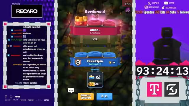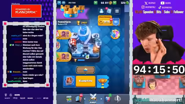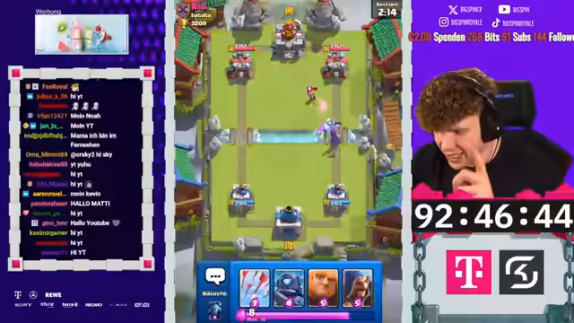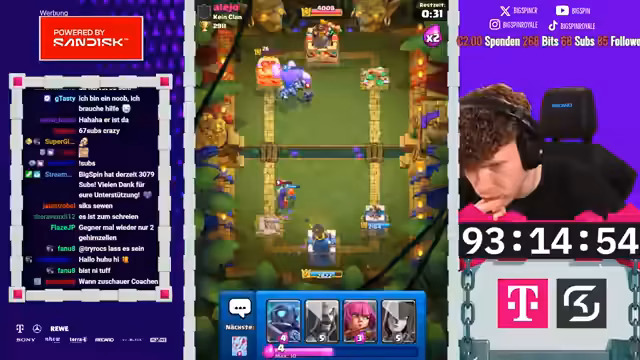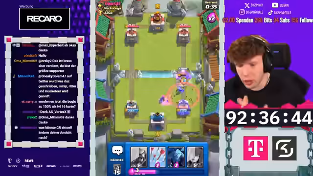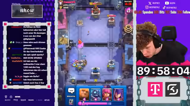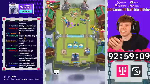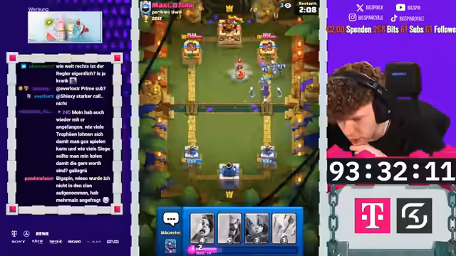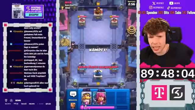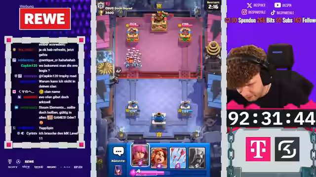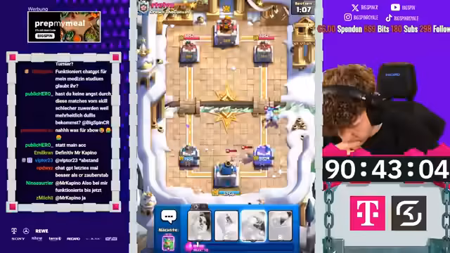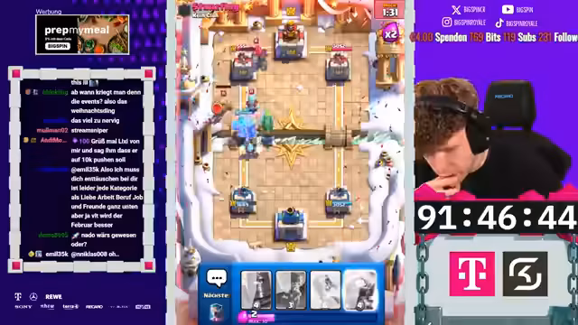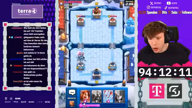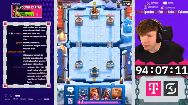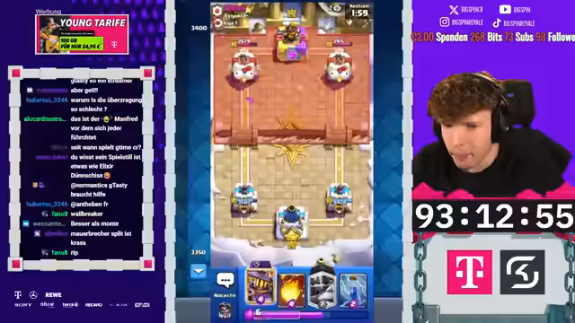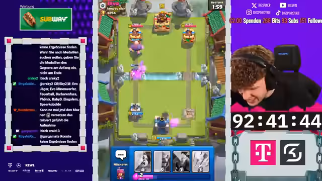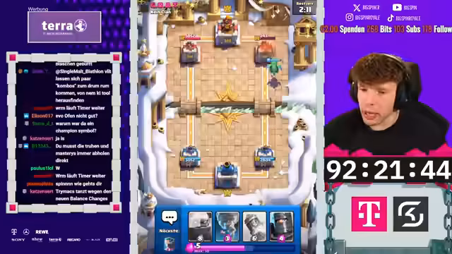 03:46:11Nach einem Neustart des Spiels (wegen fehlender Zauber) und kurzer Unterbrechung folgt ein neuer Lauf. Das Gameplay ist weiterhin von wechselhaften Matches geprägt: Mal gelingen starke Pushes mit Golem und Baby-Dragon, mal gibt es Verluste durch schlechtes Matchmaking oder Fehlentscheidungen. Der Streamer kommentiert kritisch die Spawn-Mechaniken von Einheiten und betont die Bedeutung von Timing und Präzision. Trotz Rückschlägen bleibt das Ziel bestehen, die 12 Siege zu erreichen und zusätzliche Belohnungen zu sichern.