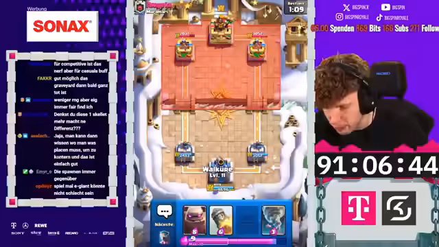 03:23:12Ein weiterer GC-Lauf wird gestartet. Trotz anfänglicher Erfolge (6:0) kommt es erneut zu Problemen mit dem Matchup, z.B. gegen Lava-Decks. In der Belohnungsphase werden viele Minipacka-Karten (90 Stück) gezogen, die direkt auf Level 10 gebracht werden können. Zusätzlich werden Dark Prince, Prinzessin und andere Karten geupgraded. Der Streamer nutzt das Gold (über 110.000) für Upgrades und betont, dass Karten wie Runenriesen und Lightning wichtiger sind als legendäre Karten für den Fortschritt. Das Ziel bleibt, die 12 Siege in einer Challenge zu erreichen.