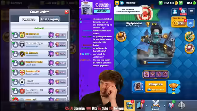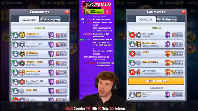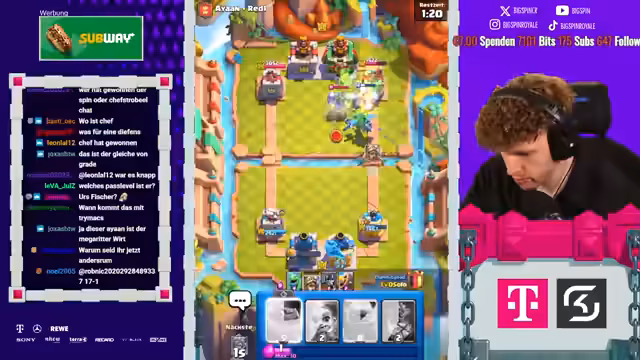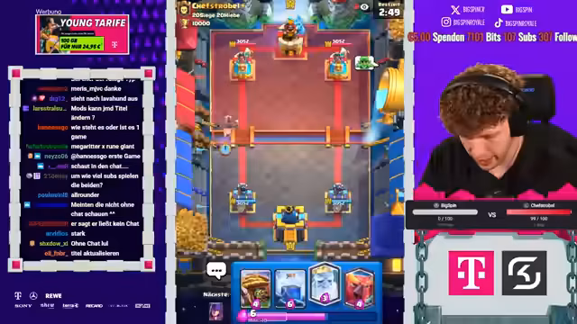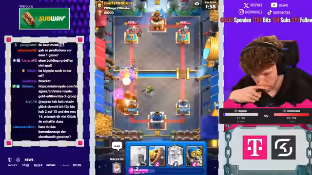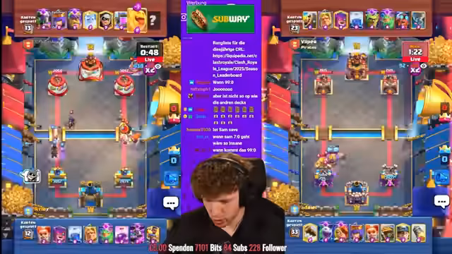 00:00:50Der Streamer bereitet sich auf das CRL Quali Finale vor und kündigt einen Stream mit dem Titel '1.000.000$ CRL QUALI FINALE mit SAM! DANACH 99-0 vs. CHEFSTROBEL in MEGA AUSWAHL' an. Er aktualisiert die Anzeige und äußert seine Vorfreude auf den bevorstehenden Stream. Es wird eine Ankündigung auf Instagram gemacht. Der Fokus liegt auf dem Free-to-Play-Account, wo einige Runden in der GC gespielt werden sollen. Der Streamer erklärt, dass das CL um 16 Uhr beginnt und der Gegner mit dem Ofen spielt, woraufhin Poison eingesetzt wird. Es folgen erste Spielzüge und Taktiken auf dem Free-to-Play-Account, wobei der Streamer die Aktionen des Gegners analysiert und kommentiert. Er setzt verschiedene Karten wie Hexe, Ritter und Graveyard ein, um den Tower des Gegners zu zerstören und in Führung zu gehen. Der Streamer erklärt, dass es sechs Tickets für die CLL dieses Jahr geben wird, für diejenigen mit den meisten Punkten. Sam befindet sich aktuell auf Platz sechs dieser Rangliste und hat somit noch gute Chancen, sich zu qualifizieren, muss aber heute performen, da ihm einige Spieler dicht auf den Fersen sind.