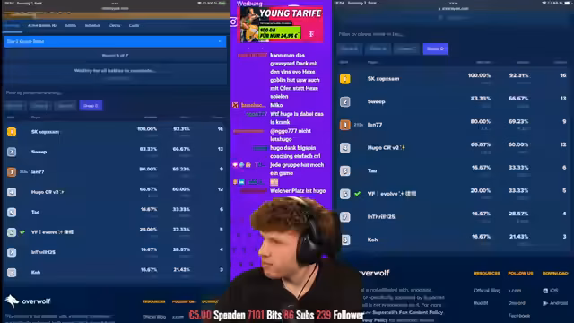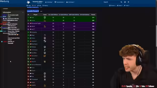00:22:35Der Streamer schließt das zweite iPad an und startet den CL-Stream auf Twitch, wobei er die Zuschauer auffordert, nur zu chatten, wenn sie Gehirn haben. Er geht mit Dummse in den Call und bereitet alles für die CL vor. Es wird betont, dass es heute für Sam um alles geht und es unfassbar wichtig ist, dass er das Rennen macht. Der Streamer erklärt erneut, dass Sam punktetechnisch von anderen Spielern eingeholt werden kann und er dies heute vermeiden sollte. Es wird das Leaderboard gezeigt und die Spieler, die Sam noch einholen können, werden genannt, darunter Sandbox, Adriel, Pedro und Viper. Sam ist im Spiel und es wird betont, dass er der einzige Deutsche ist, der es noch in die CLL schaffen kann. Es wird erklärt, dass die ersten sechs Leute aus der Tabelle, die die meisten Punkte gefarmt haben, weiterkommen. Sam steht kurz davor, in sein drittes Monthly Final zu kommen und muss eine schlechte Performance vermeiden, um nicht auf Platz 7 abzurutschen.