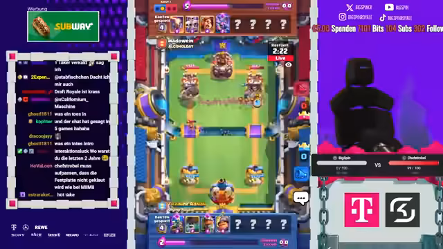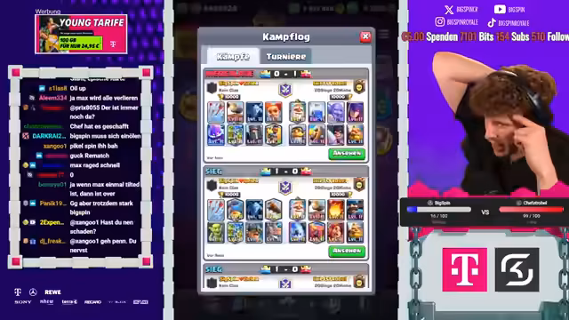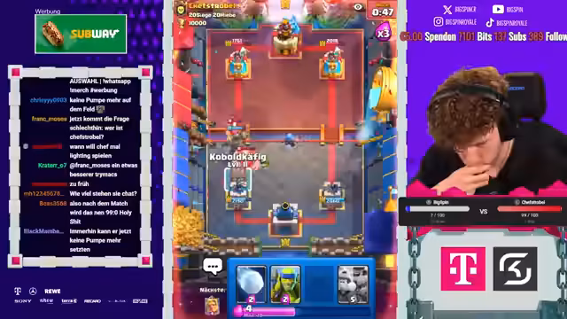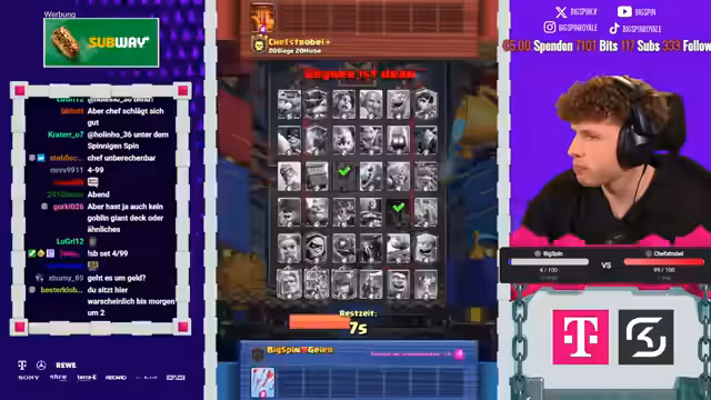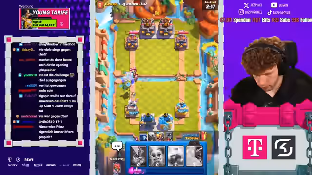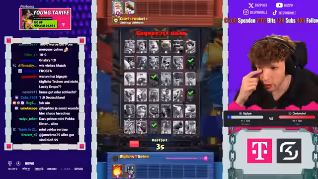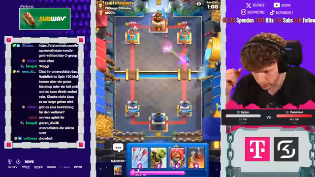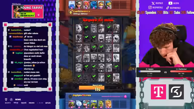 04:50:31Der Streamer hat wieder First Pick. Er wählt Mönch. Chef Strobel wählt Kanone-Cover, Ofen und Ritter. Der Streamer wählt Barberl und Minions. Chef Strobel wählt Bogies und Drill. Der Streamer wählt Cage und Ghost. Chef Strobel wählt Schneeball und Feuerball. Der Streamer wählt Bomber. Der Streamer gewinnt das achte Spiel. Der Streamer sagt, dass er Lightning Value bekommt. Der Streamer sagt, dass er ein sehr cooles Deck hat. Der Streamer sagt, dass er sehr, sehr gut gedraftet hat. Der Streamer sagt, dass er nicht weiß, wie Chef Strobel Royal Giant Minutes treffen will. Der Streamer sagt, dass er Angie sehr, sehr gut hat. Der Streamer sagt, dass er die Heteball picken muss. Der Streamer sagt, dass Chef Strobel kein Gebäude hat. Der Streamer sagt, dass es scheppern wird.