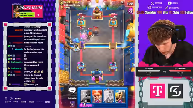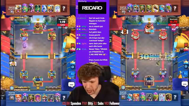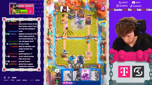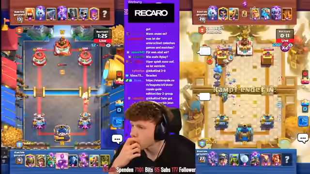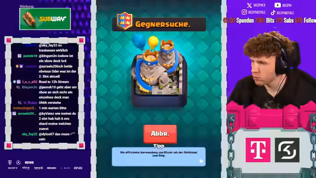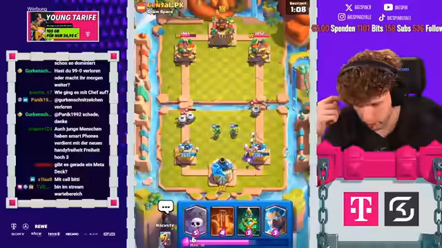 07:32:56In einer Reihe von intensiven Clash Royale Matches kämpft der Streamer um den Sieg. Trotz anfänglicher Schwierigkeiten und ungeduldiger Momente gelingen wichtige Verteidigungen und Angriffe. Der Fokus liegt auf strategischen Zügen, dem Einsatz von Golems und der Notwendigkeit, den Gegner zu überlisten. Es gibt Frustration über ungenutzte Rages und überraschende Wendungen im Spielverlauf. Trotzdem werden kontinuierlich Kronen gesammelt, wobei das Ziel von 90 Kronen immer näher rückt. Die Spiele sind geprägt von knappen Entscheidungen, riskanten Manövern und der ständigen Suche nach der optimalen Strategie, um den Gegner zu bezwingen. Die Community feuert an und unterstützt den Streamer bei seinem Vorhaben, die benötigten Kronen zu erreichen und das Opening zu starten.