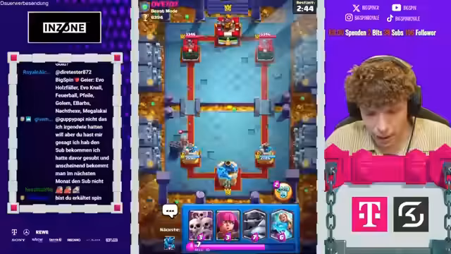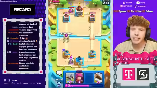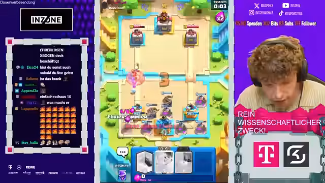 02:41:45Aufgrund des Drucks des Chats, der Sub-Gifts als Belohnung für das Experiment anbietet, gibt der Streamer nach. Er beginnt die Classic Challenge mit dem X-Bogen-Deck, um wissenschaftlich zu testen, wie sich Gegner auf dieser Trophäenstufe gegen das als übermächtig geltende Deck verhalten. Gleichzeitig betont er immer wieder, dass dies nicht aus Spaß, sondern ausschließlich zu Forschungszwecken geschieht, und distanziert sich von der gewählten Strategie.