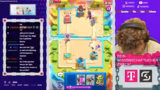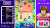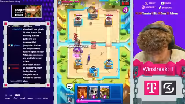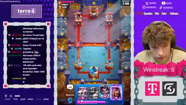 03:17:16Die Siegesserie setzt sich fort und der Streamer nähert sich seinem Trophäenziel. Er erreicht den 9. Sieg und steht kurz davor, die Belohnungen der Challenge zu erhalten. Ein Gegner stellt ihm mit einem E-Golem-Deck erstmals etwas ernsthaftere entgegen, aber der Streamer kann auch dieses Spiel für sich entscheiden und seinen Vorsprung ausbauen.