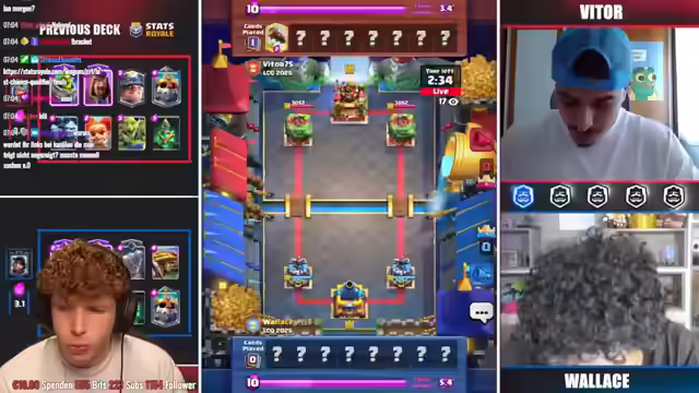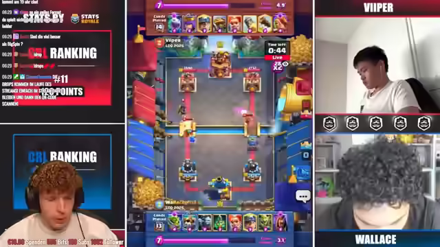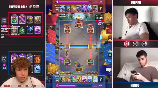 02:38:31Es wird festgestellt, dass Magier und Hexe häufig in den Decks vorkommen. Wallace spielt mit dem Lock, während Viper zunächst nichts zeigt. Es wird überlegt, dass Viper möglicherweise das Royal Hogs Deck spielt und Wallace den Mortar. Die Strategie von Viper, den Ofen gegen die Kanone einzusetzen, wird hervorgehoben, um Lightning zu vermeiden. Es wird spekuliert, dass Viper entweder Greifert oder Royal Giant spielen könnte. Der Feuerball deutet auf Agis hin, was gut gegen Wallace' DPS ist. Es wird erwartet, dass ein dicker Lightning von Wallace kommt, wenn er genug Elixier hat. Viper gewinnt das Spiel, obwohl er nicht optimal gespielt hat, was auf die Stärke seines Decks zurückgeführt wird. Es wird ein Profil von Viper besprochen, das verrät, dass er Platz 1 Global Finish und Season Finish hat. Es wird angemerkt, dass nur sehr wenige Spieler beides auf einem Account haben.