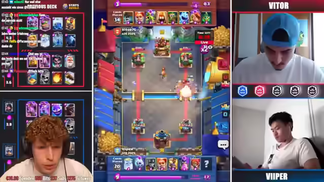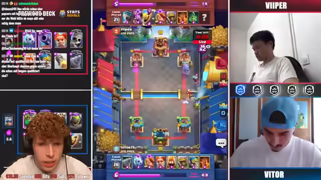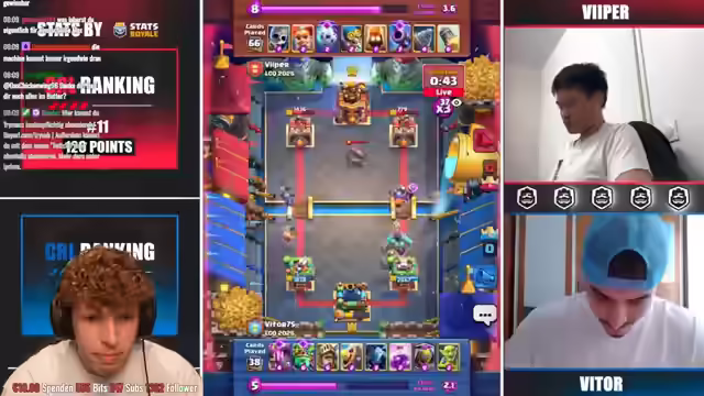 04:01:23Es steht das alles entscheidende Match an. Gewinnt Viper, ist er bei der WM dabei. Gewinnt Vitor, gibt es ein Best of Five. Es ist kein Koch dabei. Viper spielt sein Armeendeck mit Hawke-Echse. Vitor mit E-Spirit, Bomber, Hexe, Skellyking. Viper hat gute Karten mit Kyre und Luftpost. Viper hat Pfeile plus Schneeball. Vitor gewinnt das. Viper ist nicht so konsequent. Er hat nur die Wallis zum Threshern. Es wurde analysiert, dass Viper mit Miner nicht zurückliegen will. Evo Schneeball ist zu massiv. Die Valkyra hat ewig getankt. Es ist ein krankes Game mit 20 HP Unterschied. Viper hat Big Spell Vorteil. Vito hat Skelly King Vorteil und 3 Karten Cycle. Beide können es nicht verteidigen. Es ist immer Damage. Beide sind gleich AP. Es gibt ein allerletztes Best of 5.