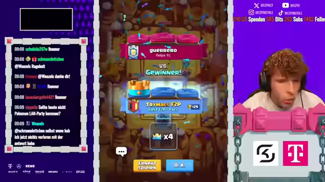04:30:38Die World Finalisten werden vorgestellt, wobei ein veraltetes Bild kritisiert wird. Die Teilnehmer werden als heftige Namen bezeichnet, und es wird spekuliert, wer gewinnen könnte. Ein Underdog wird erwähnt. Es wird überlegt, ob es einen Code für einen Banner gibt. Der Streamer plant, eine Folge zu giften und Kartenwitze zu machen. Er hat jedoch wenig Zeit, da er eine LAN-Party vorbereiten und für das Oktoberfest packen muss. Es wird über das Erreichen von 10k auf dem Free-to-Play-Account gesprochen. Der Streamer verabschiedet sich von einem Gast und kündigt an, selbst zu spielen. Es wird auf einen Banner hingewiesen und der QR-Code gezeigt. Der Banner wird als hässlich, aber geil beschrieben. Der Streamer wählt den Banner aus und richtet das Gameplay ein. Zuschauer werden eingeladen, dem Clan beizutreten, wenn sie aktiv sind und Free2Play plus Pass spielen. Es wird eine Coaching-Session angekündigt, um auf 9k zu kommen. Es wird vor zu hohen Erwartungen gewarnt.