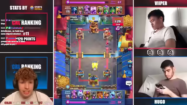 02:27:16Es wird über die mentale Belastung durch bestimmte Spielweisen wie X-Bogen diskutiert. Die Top-Spieler wie Vitor werden analysiert, wobei seine aktuelle Top-3-Positionierung hervorgehoben wird. Es wird erwähnt, dass Wallis heute noch nicht im Spiel gesehen wurde, aber zuvor Riley und andere besiegt hat. Die Struktur des Turniers wird erläutert: Upper Bracket Final, Lower Bracket Final und Grand Final, wobei der Gewinner des Grand Finals ein goldenes Ticket erhält. Es wird festgestellt, dass einige Zuschauer die Fähigkeiten des Streamers im Vergleich zu anderen Spielern unrealistisch einschätzen und fälschlicherweise annehmen, dass er automatisch die Weltmeisterschaft gewinnen würde, nur weil er besser als sie ist. Es wird über verschiedene Deck-Kombinationen und deren Effektivität diskutiert, einschließlich des Einsatzes von Evo Executioner und Goblin Giant. Strategien und Meta-Entwicklungen im Spiel werden analysiert, wobei betont wird, wie wichtig es ist, der Meta zu folgen, um erfolgreich zu sein.