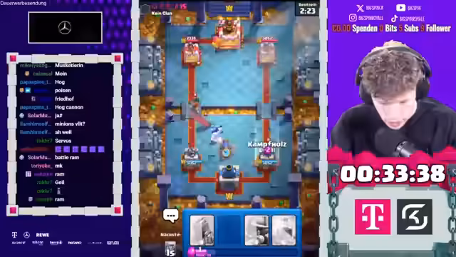 01:29:57Es wird über eine 500-Euro-Leader-Wette gesprochen, bei der es darum geht, wer in der OG-Season am höchsten finisht. Es wird erwähnt, dass das aktuelle Duell ein Warm-up dafür ist. Es wird überlegt, welches Deck der Gegner spielt. Es wird festgestellt, dass der Ehrgeiz ungebrochen ist und das Ziel ist, den anderen Account zu überbieten. Es wird erwähnt, dass das Duell dazu dient, so hoch wie möglich aufzusteigen, eventuell sogar in die Top 50 der Welt. Chris spendet 20 Euro für den Gewinner. Es wird betont, dass im Zweifel immer der Spin gewinnt. Der Streamer spielt gegen Molight im ersten Match und hadert mit dem Matchup. Hoden Kobold spendet 20 Euro und übernimmt die Überweisungskosten. Es wird über die Lautstärke von Big Spin und der Musik diskutiert. Der Streamer fragt sich, wie er gegen Mortar Hunter durchkommen soll. Coden Hobart spendet 20 Euro. Der Streamer hat Probleme mit seiner Brille. Er hofft, dass Molight nicht gewinnt und zeigt Respekt vor dessen Titel als World Champion.