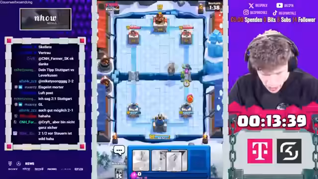 00:39:58Der Streamer steht Salih gegenüber und analysiert dessen Kartenauswahl, darunter Pfeile und Zepp. Er entscheidet sich für eine spezielle Strategie mit Nado und Guards, um sich nicht sofort auf eine bestimmte Taktik festzulegen. Er kommentiert die Versuche des Gegners, seine Einheiten zu kontern und wählt Seppis, um flexibel zu bleiben. Es folgt eine detaillierte Auseinandersetzung mit den Karten des Gegners, einschließlich Henker und Golden Knight. Der Streamer kontert mit Sparky und Ritter, wobei er betont, dass er nur OG-Karten spielt. Er muss auf den Royalen Riesen zurückgreifen. Der Gegner wählt Graveyard, woraufhin der Streamer mit Kobolden kontert, um sich gegen Graveyard und Wallbreaker zu verteidigen. Es kommt zum Einsatz von Royal Giant und Sparky, um Druck auf den Gegner auszuüben. Trotz guter Verteidigung des Gegners gelingt es dem Streamer, Schaden am Turm zu verursachen. Er analysiert die Spielweise des Gegners und setzt Sparky und Guards ein, um die Angriffe abzuwehren. Durch geschicktes Zappen und den Einsatz von Rittern gelingt es ihm, einen Turm zu zerstören und den Sieg zu erringen.