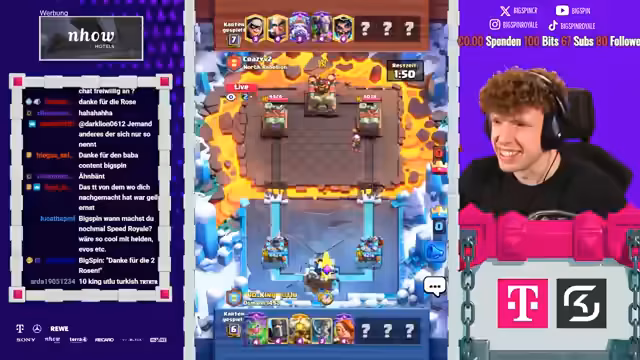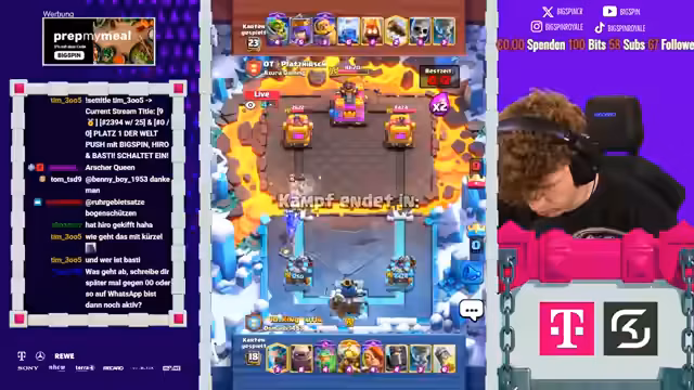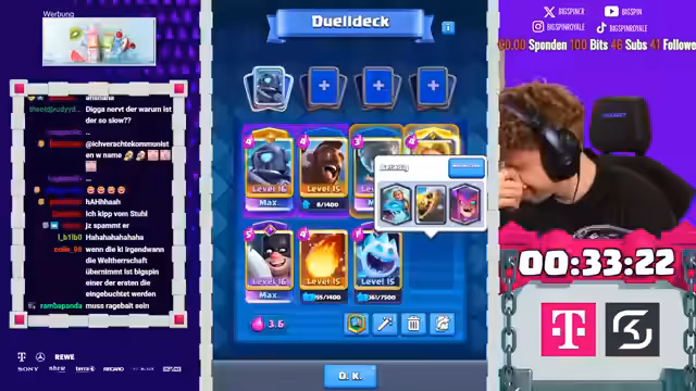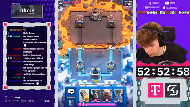 02:39:53Hiro und Lord treten dem Stream bei, und der Streamer plant ein kooperatives Duell, um Platz 1 und 2 der Welt zu erreichen. Sie diskutieren Decks, wobei der Streamer Varianten mit BigSpins und unterschiedlichen Ansätzen hervorhebt. Während des Spielens aktualisieren sie Ranglisten: Lord erreicht Platz 10, Hiro Platz 14, mit nur einem Spiel Unterschied. Die Interaktion zeigt strategische Diskussionen, etwa über Karten wie Boss Bandit oder Mini-Pekka, und wie sie gegnerische Decks analysieren. Dieser Abschnitt unterstreicht die Team-Dynamik und den Fokus auf Ranking-Push, wobei technische Aspekte wie Elixiermanagement und Timing besprochen werden.