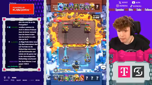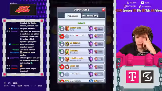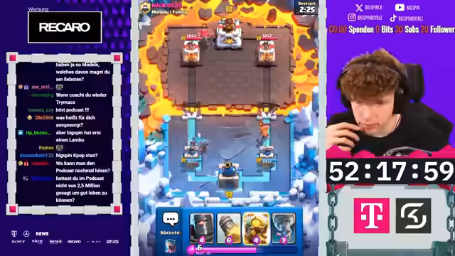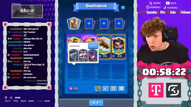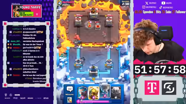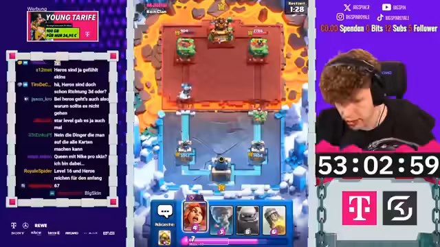 00:00:04Der Stream beginnt mit der Begrüßung des Chats und der Einrichtung der Audio- und Videokonfiguration. Der Streamer kündigt das Free2Play-Hardcore-Projekt an, bei dem er verschiedene Herausforderungen durchspielen wird, und zeigt viel Motivation. Er kommentiert ein eben geschautes Fußballspiel zwischen Bayern München und Wolfsburg, das ihm sehr gefallen hat, und geht dann direkt zur Clan-Truhe, um neue Karten zu ziehen. Dabei freut er sich über die erhaltenen Karten wie Berserkerin und eine legendäre Karte, beschreibt sie als underrated, und erwähnt, dass der Clan in den Clan-Kriegen an erster Stelle steht. Der Streamer bereitet alles für den Live-Betrieb vor, inklusive der Drops und Ankündigungen, und ist sehr gespannt auf den Verlauf des Tages.