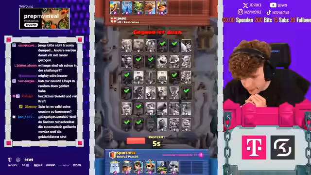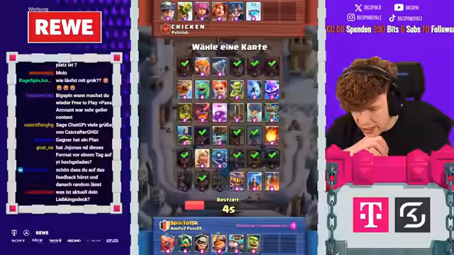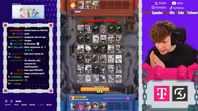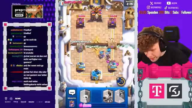 01:15:54Mit nun 10 Siegen ging es in die letzten Matches. Die Kartenauswahl umfasste Fischer, Boss-Bandite und Skelly King. Trotz eines guten Decks unterlag der Streamer schließlich einem Gegner mit starker Pekka- und Grabstein-Kombination. Nach insgesamt zehn Siegen endete der Stream mit einem Hinweis auf das anstehende Monty Event und einem Abschied an die Community.