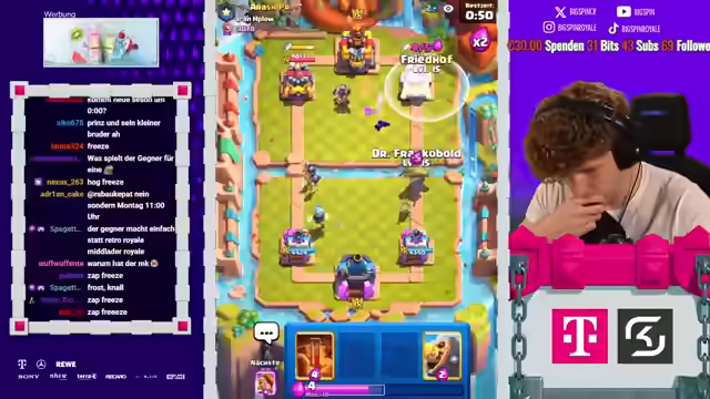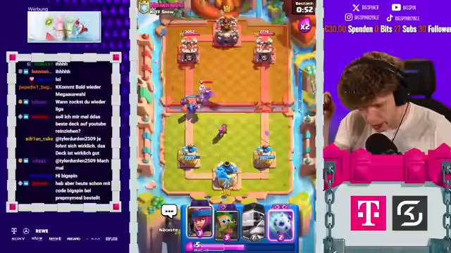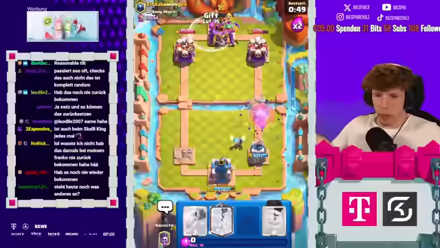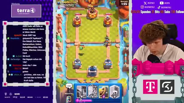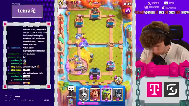 00:49:41Der Streamer startet den Season End Push im Ranglisten-Modus mit dem Ziel, seinen Allzeit-Trophäen-Rekord zu brechen. Er beginnt auf Platz 1110 und hofft, dass sein Deck wieder gut funktioniert. Das erste Spiel ist gegen den Royal Clown, der einen Lock spielt. Es stellt sich heraus, dass der Gegner einen X-Bogen spielt, was für den Streamer eine Herausforderung darstellt. Er versucht, mit einem Cage und einem Bubble dagegenzuhalten, aber der Gegner lässt einiges an Schaden zu. Der Streamer muss seinen Kyra außen spielen, um nicht von Nado rangezogen zu werden. Er setzt auf Pressure und hofft, dass der Gegner keine Rakete hat. Trotz einiger Fehler gelingt es dem Streamer, das Spiel zu gewinnen. Er stellt fest, dass sein Allzeit-Medaillen-Rekord bei 3049 liegt und er diesen gerne brechen möchte. Es folgen weitere Spiele gegen verschiedene Decktypen, darunter Rekruten, Horgis und Golem-Decks. Der Streamer hat Schwierigkeiten, gegen einige dieser Decks zu spielen, macht Fehler und verliert einige Spiele. Trotzdem gibt er nicht auf und versucht, sich zu verbessern und weitere Spiele zu gewinnen.