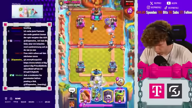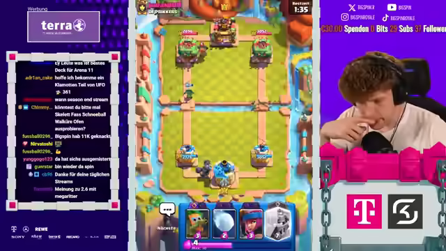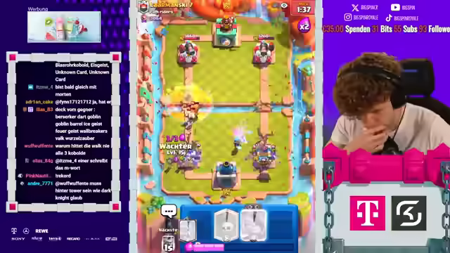 00:37:15Es wird ein Spiel gegen einen Gegner mit einem Minenwerfer erwähnt, wobei der Streamer Snowballs einsetzt, um den Schaden zu minimieren. Der Minenwerfer erweist sich als nervig, und es wird betont, wie wichtig es ist, ihn schnell auszuschalten. Es wird die Möglichkeit erwähnt, mit einem MK (Mega Ritter) auf den Helden des Gegners zu zielen, um das Spiel zu drehen. Ein weiteres Spiel gegen einen Gegner mit einem Skelettfass wird beschrieben. Der Dart-Goblin wird eingesetzt, um das Skelettfass abzuwehren, aber die Valkyre des Gegners erweist sich als störend. Trotzdem gelingt es, eine vorteilhafte Situation zu schaffen und in Führung zu gehen. Der Gegner versucht, mit einem Holzfäller und einem Lachsfass durchzukommen, aber der Streamer kontert mit Darkgums und einem Schneeball. Der Gegner kommt jedoch näher an sein Ziel, was den Streamer unter Druck setzt. In den letzten Sekunden wird ein Wunder benötigt, um das Spiel zu drehen, aber die Evo-Valküre des Gegners macht es schwierig. Es wird festgestellt, dass viele Spieler das gleiche Deck mit dem Skelettfass spielen, was eine Herausforderung darstellt.