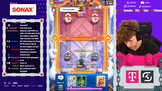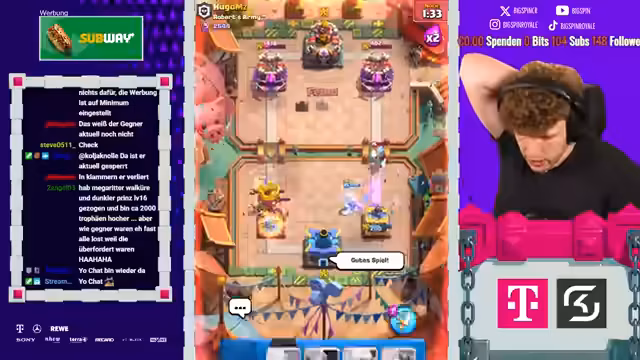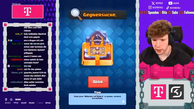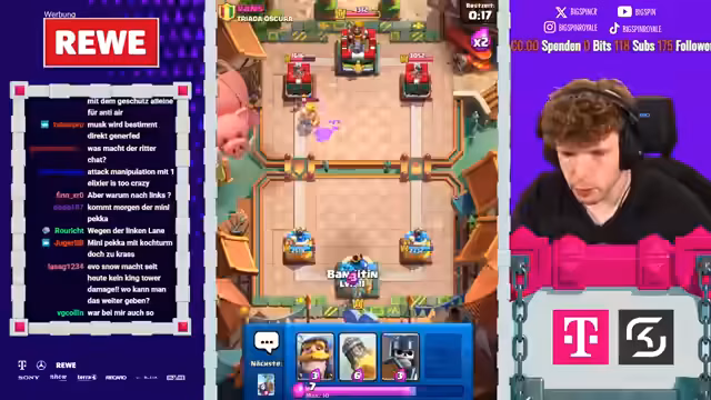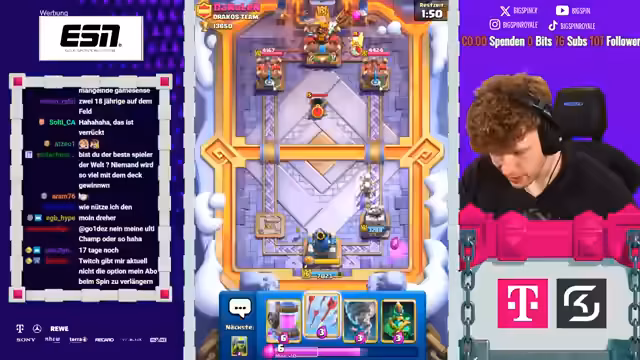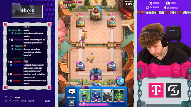 01:45:22Der Streamer äußert sich kritisch über Gegner, die trotz Level 16 und evolutionierter Magier und Walküre seine Warnungen ignorieren und dadurch verlieren. Er spielt anschließend gegen einen Gegner namens Adi, der den Fehler gemacht hat, eine Turm-Truppentruhe zu wählen, um Level 15 zu erreichen, anstatt die Prinzessin auf Level 15 zu bringen. Dies bezeichnet der Streamer als ein 'Loser-Mindset'. Im weiteren Verlauf des Spiels setzt der Streamer Rankenbanken und einen Heiligen Geist ein, um den Goblin-Riesen des Gegners zu kontern. Er bemerkt, dass der Heilige Geist unsterblich wirkt und plant, eine weitere Elixierpumpe zu platzieren, um den Gegner unter Druck zu setzen. Der Streamer muss seine Strategie anpassen, da der Gegner gut spielt und er nur bei günstigen Gelegenheiten angreifen kann.