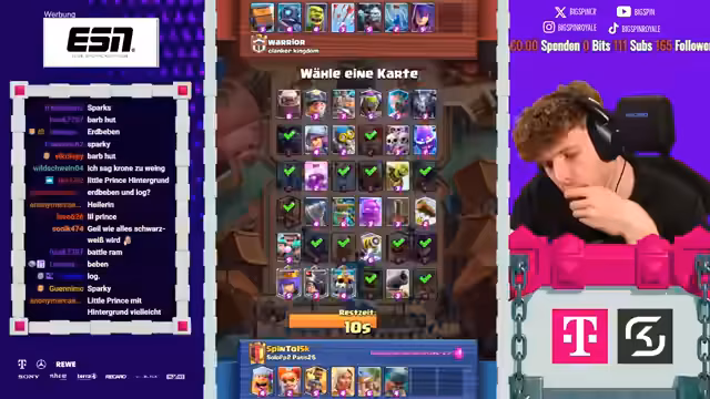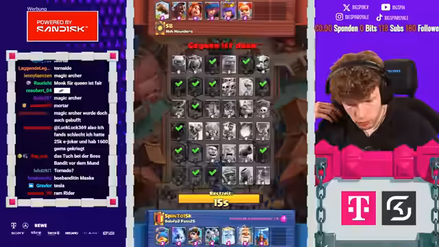 02:53:06Trotz anfänglicher Schwierigkeiten und knapper Niederlagen, bei denen ihm nur wenige Trophäen zum Ziel fehlen, kämpft sich der Streamer weiter. Er trifft auf verschiedene Deck-Kombinationen, darunter Pekka-Kanone-Henker und Lamb-Balloon-Bridge, die ihm zunächst Probleme bereiten. Doch mit seinem angepassten Deck, das auf E-Golem, Heilerin und Baby Dragon setzt, gelingt es ihm, die Gegner zu besiegen und schließlich die entscheidenden Trophäen zu gewinnen. Der Streamer feiert diesen Erfolg als neuen Weltrekord für den „schlimmsten und räudigsten Clash Royale Push der Neuzeit“. Nach einer kurzen Pause und einem Snack, um sich zu stärken, kündigt er den Beginn einer neuen Challenge an: Das „Rad der Farben“, das bestimmen wird, welche Karten er in zukünftigen Spielen wählen darf. Er erklärt die Regeln und die Auswahl des spezifischen Farbrads, das auch seltene Farben wie Navy und Dunkelblau berücksichtigt.