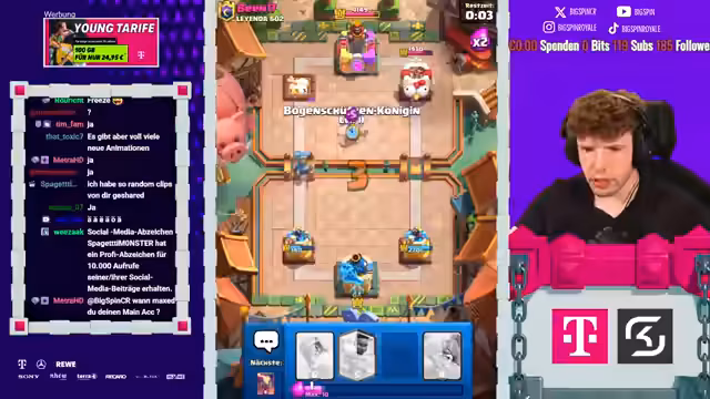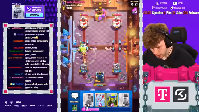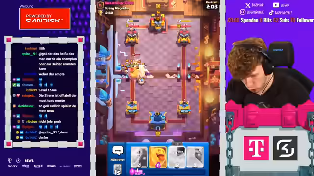 01:57:10Der Streamer spielt gegen Pito Finio und setzt eine Zauberkarte ein, während der Gegner direkt Zauber-Value gibt und eine Level-16-Karte besitzt. Er benötigt seine Elixierpumpen und setzt eine Sirene, da der Gegner möglicherweise ein Erdbeben spielt. Der Gegner hat tatsächlich ein Erdbeben, was das Spiel für den Streamer erschwert. Er setzt eine weitere Pumpe und erklärt, dass der 'Serien-Mini-Pekka-Emote' erst ab Level 16 einer Karte erhältlich ist. Der Gegner spielt Skelette und einen 'Lock', woraufhin der Streamer Heilerinnen einsetzt. Er kommentiert, dass das Hochleveln von Karten langfristig besser ist, auch wenn es anfangs mühsam ist. Der Streamer setzt weitere Heilerinnen ein, um das Spiel zu beenden, während der Gegner versucht, sich zu verteidigen, aber nicht ans Telefon geht, um seine Niederlage zu akzeptieren.