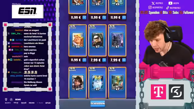 00:04:53Der Streamer beginnt eine detaillierte Berechnung, wie viel Gold und Gems benötigt würden, um seinen gesamten Account zu maximieren. Es wird festgestellt, dass es 121 Karten im Spiel gibt, und um alle auf das höchste Level zu bringen, wären 14.520.000 Gold erforderlich. Aktuell besitzt er 5.115.000 Gold. Durch verschiedene Angebote im Shop könnte er auf etwa 13 Millionen Gold kommen, wobei ihm dann noch eine Million Gold fehlen würde, die möglicherweise durch den Pass Royale oder weitere Käufe gedeckt werden könnte. Die Kosten für die Maximierung der Kartenarten werden einzeln aufgeschlüsselt: 14 gewöhnliche Karten würden 40.500 Gems (ca. 300 Euro) kosten, 19 seltene Karten 57.000 Gems (ca. 400 Euro), 28 epische Karten 110.200 Gems (ca. 800 Euro) und 18 legendäre Karten 75.600 Gems (ca. 535 Euro). Champions würden zusätzlich 42.000 Gems (ca. 300 Euro) erfordern. Insgesamt schätzt der Streamer die Kosten auf über 1000 Euro, um seinen Account zu maximieren, was das Projekt für den heutigen Tag begräbt. Er erwähnt auch, dass er 20% mehr ausgeben müsste, da die Preise für Gems gestiegen sind. Dies führt ihn zu dem Schluss, dass die Gesamtkosten für eine vollständige Maximierung seines Accounts bei etwa 2650 Euro liegen würden.