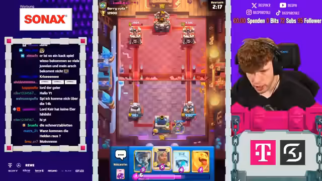 01:43:47Der Streamer bemerkt, dass der gegnerische Magier Level 16 ist, was ihn überrascht, da der Gegner auf 13.000 Trophäen spielt und somit nicht unterlevelt ist. Dies führt zu einer erhöhten Schwierigkeit im Spiel, woraufhin der Streamer beschließt, mehr Elixierpumpen zu stapeln, um dem gestiegenen Schwierigkeitsgrad proportional entgegenzuwirken. Er fragt sich, was der Gegner auf diesem Trophäenlevel zu suchen hat und wie das Spiel weiter verlaufen wird. Er entscheidet sich, massiv auf den 'Pay-to-Win-Stein der Weisen' zu setzen und setzt Aero-Zauber und andere Karten gegen den gegnerischen Magier ein. Der Streamer wundert sich über die Spielweise des Gegners, insbesondere über den Einsatz von 'Weins', trotz des hohen Flächenschadens, den er besitzt.