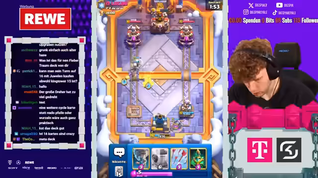 01:53:52Der Streamer spielt gegen Astro, der ein Golem-Beatdown-Deck verwendet. Er setzt eine Heilerin und Sperrkobolde ein und warnt den Gegner erneut. Er platziert eine Elixierpumpe und bemerkt, dass der Gegner einen Elektro-Drachen und einen Golem einsetzen wird. Er überlegt, eine weitere Sirene zu verwenden und setzt eine weitere Pumpe, obwohl er diese überlaufen lässt. Er versucht, den Golem mit Pfeilen und einem Heilgeist zu kontern, stellt aber fest, dass der Gegner gut Schaden macht und er selbst Schwierigkeiten hat, gegen den Golem durchzukommen, insbesondere mit seinen Lufttruppen. Trotz zweier Pumpen bringen diese nicht den gewünschten Effekt. Er setzt eine weitere Heilerin ein und versucht, das Spiel zu drehen, aber die gegnerische Hexe und der Mini-P.E.K.K.A. sind zu stark, was zu einer Niederlage führt. Er akzeptiert die Niederlage und den 'BM' (Bad Manners) des Gegners.