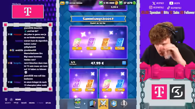 00:33:48Der Streamer entdeckt, dass der Merch Tactics Shop eine Möglichkeit bietet, Karten deutlich günstiger zu maximieren als über Gems, was er als 'Lücke im System' bezeichnet. Er beschließt, diese Lücke zu nutzen, um die neuen, exklusiven Pay-to-Win-Emotes zu erhalten, die nur durch das Sammeln einer großen Menge an Kristallen freigeschaltet werden können. Diese Kristalle erhält man, wenn man Karten über das Maximallevel hinaus erwirbt. Er startet ein Video, in dem er erklärt, dass er einer der ersten sein möchte, der diese Emotes besitzt, auch wenn er davon abrät, es nachzumachen. Zuerst maximiert er den Friedhof auf Level 16, um die Kristalle freizuschalten. Nachdem die Kristalle nicht sofort angezeigt werden, startet er das Spiel neu und entdeckt den Kristallmarkt. Er stellt fest, dass die Emotes zwar nicht unbedingt schön sind, aber den Flex zeigen, dass man viele Ressourcen in das Spiel investiert hat. Er beschließt, die Musketierin im Merch Tactics Shop zu kaufen, um überschüssige Karten in Kristalle umzuwandeln. Nach dem Kauf stellt er fest, dass das Angebot verschwindet, sobald die Karte maximiert ist. Er ändert seine Strategie: Er wird Joker auf eine Karte anwenden, sie aber nicht upgraden, dann die Angebote im Merch Tactics Shop kaufen und erst danach die Karte upgraden, um die Kristalle zu erhalten. Er kauft viermal das Mini-Pekka-Angebot, um die Kristalle zu sammeln, und erhält 19.800 Kristalle, was einem Emote für 20 Euro entspricht. Er plant, dies mit weiteren Karten zu wiederholen, um das komplette Pay-to-Win-Emote-Set zu erhalten, obwohl er betont, dass dies eine bewusste Geldverbrennung für kosmetische Items ist, die er später auch kostenlos erhalten könnte.