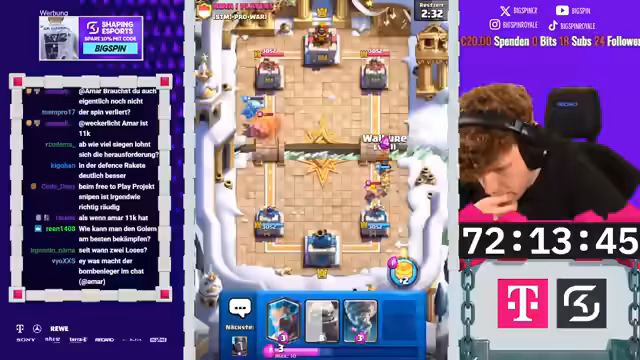 01:59:57Das Spiel beginnt mit einer anscheinend hoffnungslosen Situation, bei der der Gegner bereits den Golem kontrolliert. Es gelingt jedoch ein beeindruckendes technisches Comeback, durch das das Spiel trotz anfänglicher Übermacht des Gegners gewonnen wird. Anschließend berät der Streamer einen Mitspieler für den finalen Sieg in der Challenge. Nach einer frustrierenden Niederlage mit einem zunächst zugewiesenen Deck stellt der Streamer ein neues, solides Deck zur Verfügung, mit dem der Mitspieler schließlich den zehnten und entscheidenden Sieg erzielt.