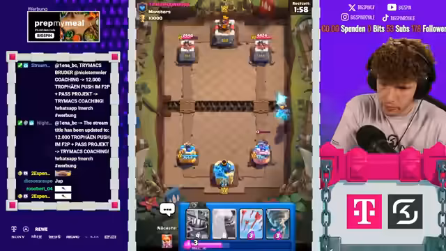 02:57:37Das Coaching wird als wahnsinnig geil und lehrreich bewertet, was zu einem Aufschwung führt. Der Streamer zeigt sich beeindruckt von den eigenen Fortschritten. Ein potenzielles 99-zu-0-Duell gegen den Bruder Trimax wird als witzige Challenge diskutiert. Der Fokus verschiebt sich zum Feed2Play-Projekt, mit dem Ziel, 12.750 Trophäen zu erreichen und die zweite Level-15-Karte zu erhalten.
