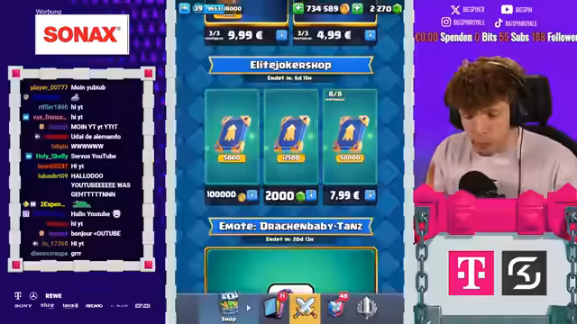 02:36:38Die Möglichkeit, den Evo Baby Dragon auf Level 15 zu bringen, wird analysiert. Die benötigten 30 Punkte Evo können für 18 Euro im Shop erworben werden. Der Streamer kritisiert die hohen Kosten für so einen kleinen Upgrade. Ein Hype-Train, der als kackbraun beschrieben wird, triggert die Käufe im Shop. Die lange Sammelzeit für die benötigten 30 Joker wird als mühsam eingestuft. Die Ausgaben für den Shop-Deal und das Level 15 Lakaien belaufen sich auf ca. 21 Euro.