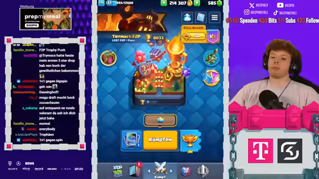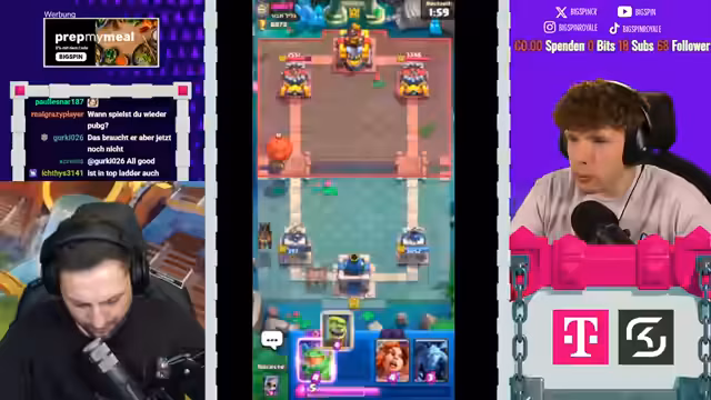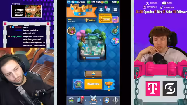 Ein Clash Royale- wurde mit Nicistemmler gestartet, der von bigspincr gecoacht wird. Der Fokus liegt auf der Analyse von Gameplay-Fehlern, Strategieanpassungen und dem Einsatz neuer Karten. Es werden verschiedene Spiele analysiert, Deck-Optionen diskutiert und Taktiken für den Trophy-Push erarbeitet. Ziel ist es, das F2P-Projekt voranzutreiben und 12.000 Trophäen zu erreichen. Der Streamer gibt strategische Hinweise und analysiert Spielzüge.