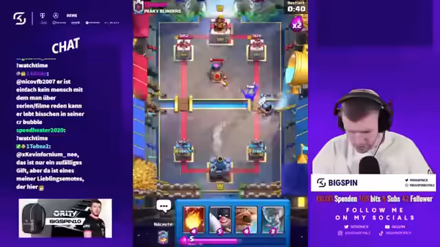 02:30:22Der Fokus wechselt zu einem Clash Royale-Duell. Die Teilnehmer diskutieren intensiv über die aktuelle Meta, insbesondere über den Nerd von Phoenix, den sie als deutlich fairer empfinden als zuvor. Es werden die Karten der Spieler analysiert und es stellt sich heraus, dass der Gegner keine effektive Antwort auf den Magier hat. Während des Spiels gibt es eine technische Störung, bei der die Karten nicht korrekt angezeigt werden, was zu Verwirrung führt. Der Gegner agiert aggressiv, spammt Karten und wird von den Teilnehmern kritisiert.