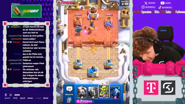 03:01:09Der Streamer erwähnt die Weihnachtstradition, am 24. Dezember eine Weihnachtsmütze zu tragen und eine Stunde lang mit dem Bogen gegnerische Spieler zu beschenken. Anschließend wird die nächste Runde vorbereitet, wobei Karten wie Inferno, Dark Prince und Fischer diskutiert werden. Es zeigt sich Frustration über die erneute Ziehung unerwünschter Karten, während gleichzeitig die Spannung für das anstehende Spiel steigt.
