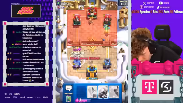 02:30:36Das Spiel verläuft schwierig, da das Deck nicht optimal ist und der Gegner scheinbar bessere Karten hat. Der Streamer versucht verzweifelt, mit den verfügbaren 'Tierkarten' wie Royal Hawks und Minions zu spielen. Ein kritischer Moment entsteht, als der Gegner einen offensichtlichen Fehler macht und den Spielzug-Button nicht findet.