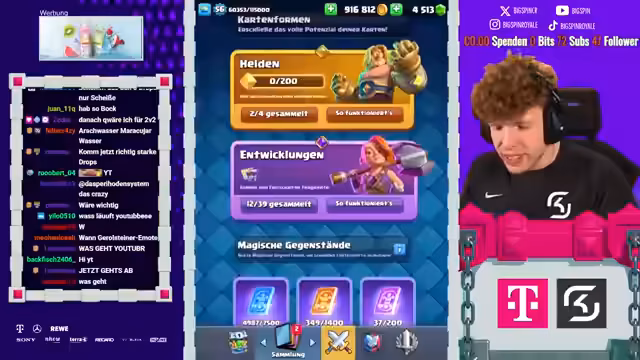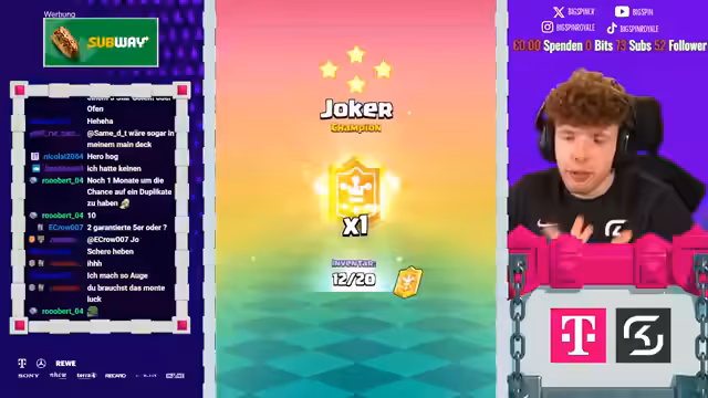 01:54:19Der Streamer erklärt die Bedeutung des Openings für den Account: Zwei 5-Sterne-Drops sind garantiert, und Karten wie Champions, Legendäre und Epische sind essenziell für Fortschritte. Obwohl einige Joker vorhanden sind, erhofft man sich durch das Öffnen entscheidende Verbesserungen für das Deck, insbesondere da Karten wie Ofen und Golem aktuell nicht optimal spielbar sind.