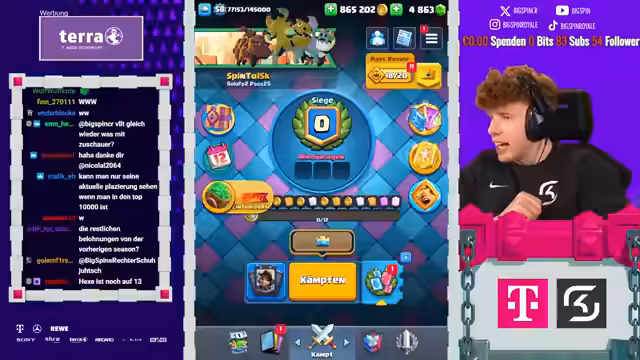 00:16:18Während des Pushs erhält der Streamer einen seltenen 5-Sterne-Lucky Drop, was kurzzeitig für Begeisterung sorgt. Er nutzt den Boost für zusätzliche Vorteile, verliert aber auch Matches, was zu Frustration führt. Dennoch bleibt das Ziel klar: 11.500 Trophäen für das Pass-Opening. Er motiviert sich und die Community weiter.