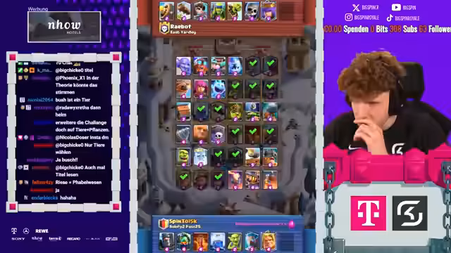 02:25:29Als neue Herausforderung wird eine Clash Royale-Runde gestartet, bei der ausschließlich Tierkarten gewählt werden sollen. Der Streamer diskutiert mit dem Chat, welche Karten als Tiere gelten (z.B. Jäger, weil er Tiere jagt). Die Draft-Phase verläuft problematisch, da nur wenige klassische Tierkarten angeboten werden, was zu Verwirrung führt.
