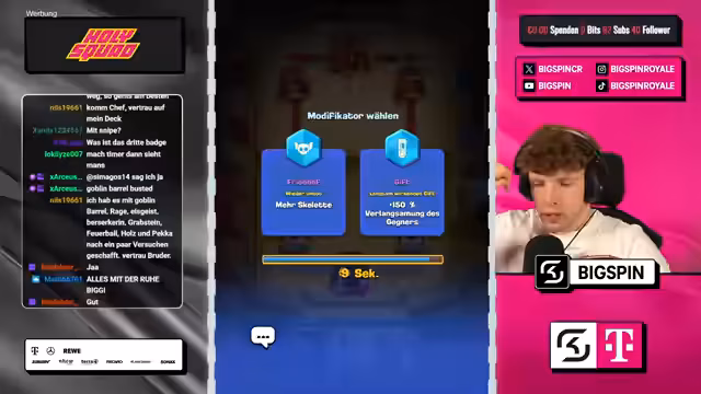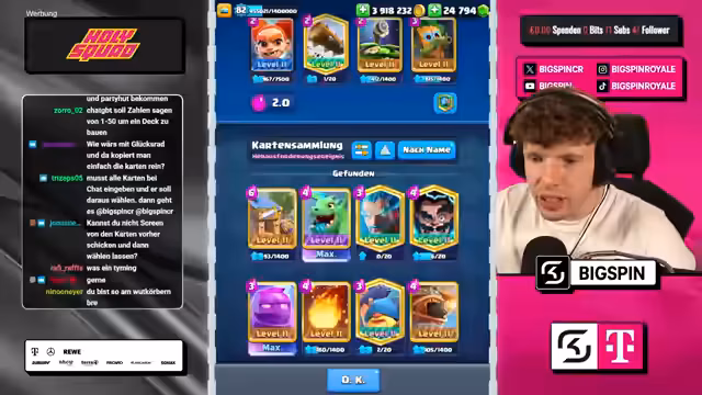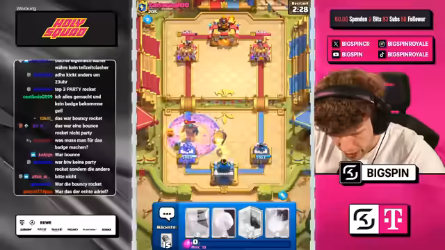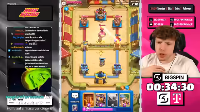 04:05:12In einem Höhepunkt des Streams gelingt es dem Streamer, das sogenannte Chaos Badge im ersten Versuch zu freischalten. Dies war das Ziel mehrerer Stunden Spielzeit für andere Zuschauer. Er teilt offen seine Strategie mit der Community: das Erstellen eines Decks mit den spezifischen Karten Koboldhütte, Magier-Trio, Minenwerfer und Barbarenwerfer. Er betont, dass es weniger auf Geschicklichkeit als vielmehr auf das Glück bei der Wahl der passenden Verstärkungen ankommt. Diese Leistung wird im Chat gefeiert, und er freut sich über das positive Feedback und die neugierigen Fragen der Zuschauer zu diesem Triumph.