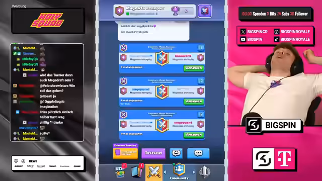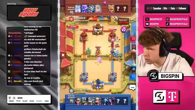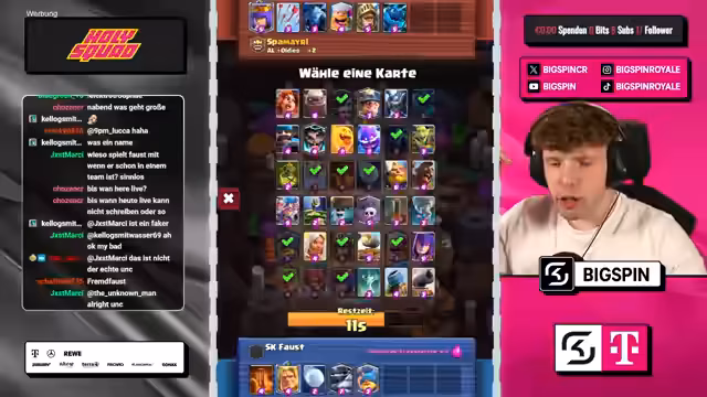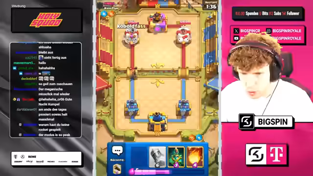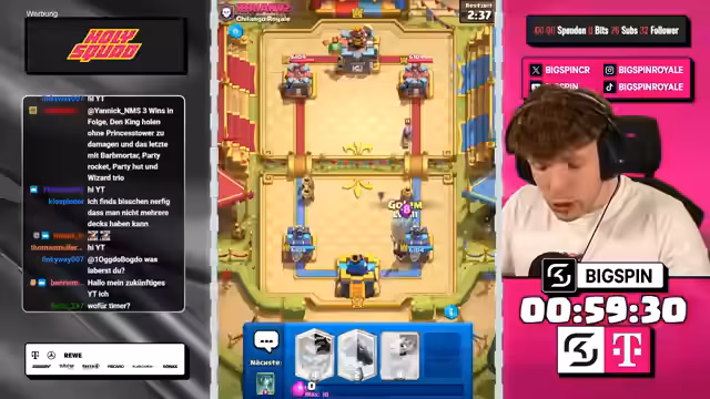 00:58:41Der Streamer geht live in die Watch Party von Sams Turnier und beginnt mit der Beobachtung der Drafts. Der erste Spieler, Busfahrer Dirk, zeigt einen starken Draft mit Geisterkaiserin, Ofen, Magier und Golden Knight, der als sehr überlegen gegen den Gegner mit Mega-Ritter-Prinz angesehen wird. Das Spiel verläuft jedoch zäh, und Busfahrer Dirk nutzt eine ungewöhnliche, langsame Strategie, die erst nach drei Minuten zum Sieg führt. Der zweite Spieler, Trainer Elefant, wählt einen suboptimalen Draft, was zu einer schnellen Niederlage gegen Hubi Laufrewe führt, da er keine effektive Antwort auf die Skelettrachen und Rekruten hat.
