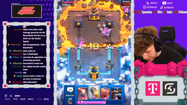 04:10:38Im Mittelpunkt des Streams steht die Konzentration auf maximale Schadensoutput (DPS). Bei der Kartenauswahl wird pro Draft entschieden, welche Karten den höchsten Schaden pro Treffer oder insgesamt erzielen. Dabei wird auf Swarm-Einheiten verzichtet, um eine reine Damage-Strategie zu verfolgen. Der Fokus liegt auf Karten wie Boss-Banditin, Phoenix, Nachthexe und Berserkerin, während Gebäude wie der Inferno-Turm und der Cage ebenfalls aufgrund ihres hohen Schadens bevorzugt werden. Die Zielsetzung ist klar, den Turm des Gegners mit dem bestmöglichen Damage zu zerstören.
