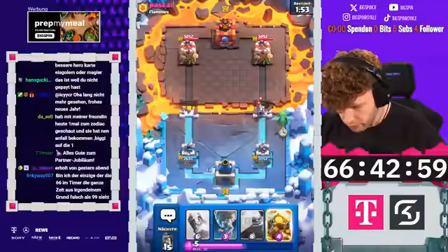 00:15:05Der Stream zeigt diverse Matches, darunter ein Spiegelmatch, in dem der Streamer ein 'Lockbait'-Deck spielt, aber auf einen Gegner trifft, der selbst keinen Lockbait-Play zeigt, was zu Frustration führt. Weitere Matches gegen Decks wie 3M (drei Musketiere) und Evo-Bogenschütze werden gezeigt. Der Streamer analysiert die Meta kritisch, bezeichnet 3M als 'massiv' und zu stark, und äußert sich über den Hero Magier, den er als unterdurchschnittlich ansieht, da der fehlende Schild ein entscheidender Nachteil ist.