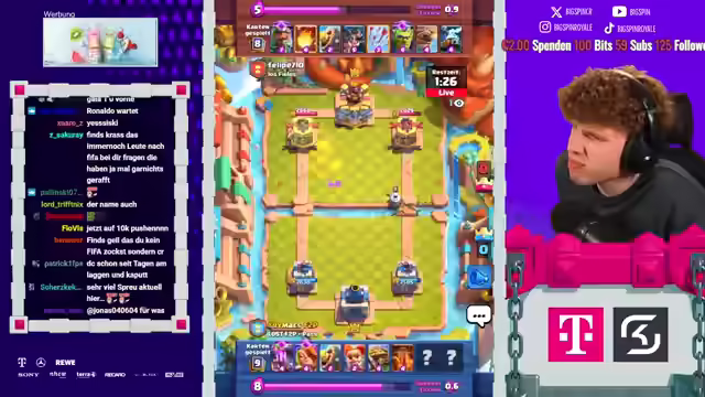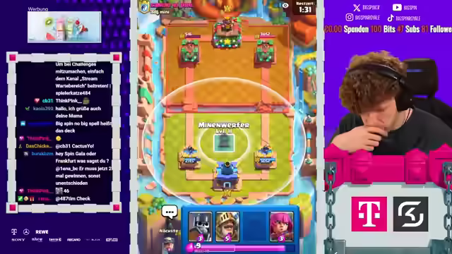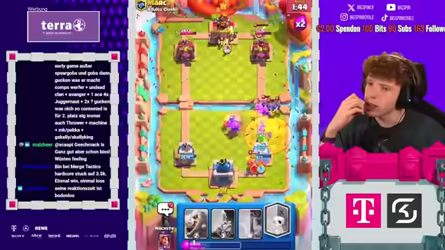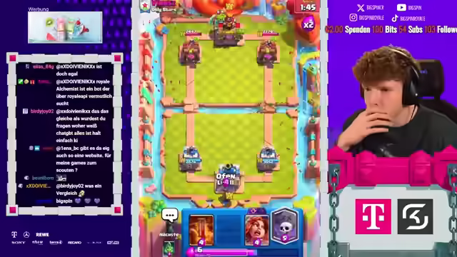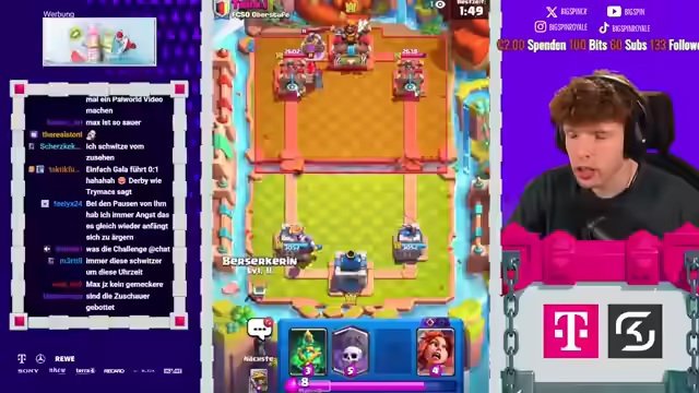 01:25:17Der Streamer freut sich über ein gutes Deck im aktuellen Spiel, sieht aber die Gefahr, im nächsten Mega-Auswahl-Spiel zu scheitern. Er startet eine neue Mega-Auswahl und hofft auf ein normales Deck, um nicht gleich in der Grand Challenge zu verlieren. Es wird über die verfügbaren Karten diskutiert, wobei der Streamer feststellt, dass es keine ideale Wing Condition gibt. Er wählt Karten wie Schweinereiter, Kanone und Eisgeist aus. Es folgt eine Diskussion über die Strategie, Rocket und Barrel zu kombinieren, um einen Three Crown zu erzielen. Der Streamer äußert Bedenken hinsichtlich der gewählten Karten und der fehlenden Synergie. Er entscheidet sich für einen Miner und betont, dass er im Deck keinen großen Zauber hat, was riskant ist. Es wird die Frage aufgeworfen, ob der Minenwerfer von dem Royal Giant gekontert wird.