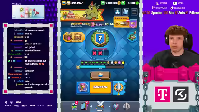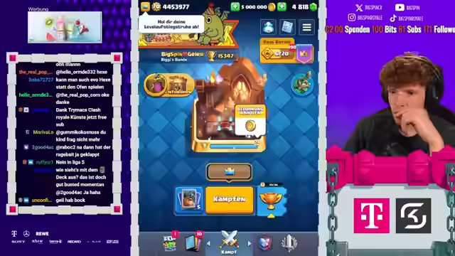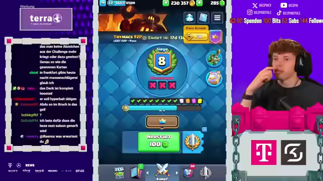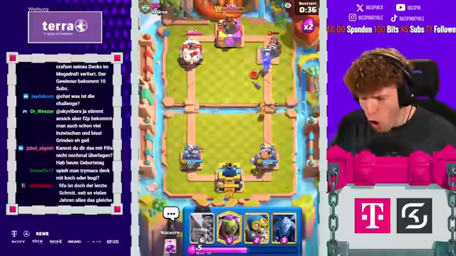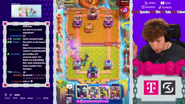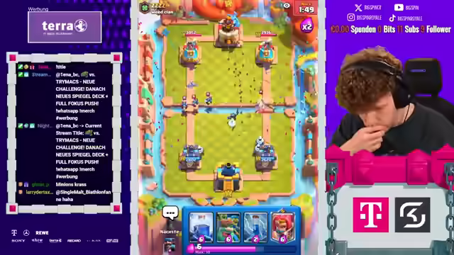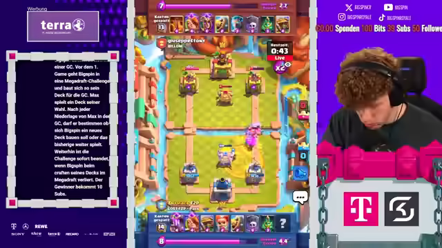 Eine neue Clash Royale Herausforderung beginnt: BigSpin vs. Trimax. Trimax spielt mit Main-Deck in Grand Challenge, BigSpin mit Mega-Draft Deck. Nach jeder Niederlage entscheidet Trimax über ein neues Deck. Ziel: BigSpin aus Komfortzone holen und Draft-Fähigkeiten fordern, während Trimax seine Grand Challenge bestreitet. Spannende Duelle und Strategieanpassungen sind zu erwarten.