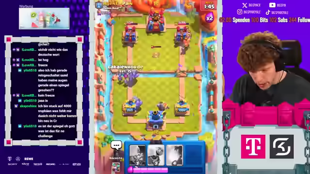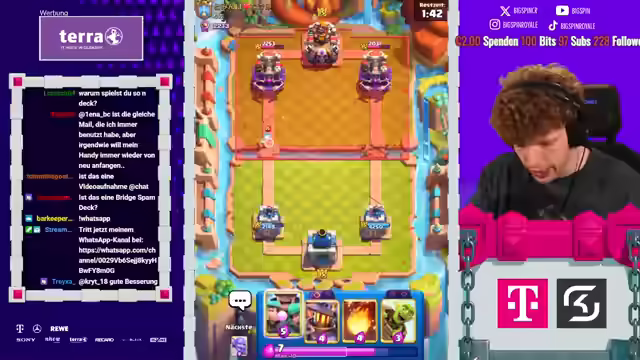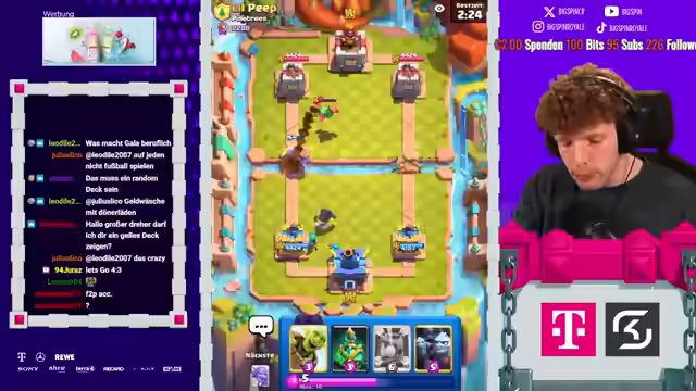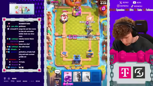 03:42:48Der Streamer beginnt ein neues Spiel gegen Krixus Love Snipe und setzt ein Goblin Barrel ein. Der Gegner spielt Pfeile, hat aber keine mehr. Der Streamer setzt Rascals ganz hinten und hat die Minion Horde und den Spiegel als Antworten. Der Gegner setzt einen Miner für die Rascals ein. Der Streamer setzt die Minion Horde ein, und der Gegner muss Pfeile spielen. Der Gegner setzt einen Ballon ein, woraufhin der Streamer den Ofen spielt. Der Streamer spiegelt den Ofen, da der Gegner keine Weins mehr hat. Der Turm des Gegners ist halb down. Der Streamer hat Rascals, den Ofen, die Minion Horde, den Spiegel und den Vines als gute Karten. Er darf dem Gegner jedoch keine Pfeile Value bieten. Der Streamer setzt Rascals ein und wartet auf den Play des Gegners. Der Gegner setzt den Ofen ein. Der Streamer setzt Weins ein, um den Ballon des Gegners zu stoppen. Der Gegner setzt einen Baby Dragon ein, woraufhin der Streamer den Ofen spielt. Der Streamer setzt einen Bowler ein, der den Gegner zurückknockt. Der Gegner macht einen guten Play, aber der Bowler knockt ihn zurück. Der Streamer hat ein Problem, da der Baby Dragon sein Dings aufessen wird. Er setzt Ranken ein, hat aber noch Feuerwehr. Er hätte Ranken und Feuerball auf den Turm werfen sollen. Der Feuerball wäre jedoch nicht rechtzeitig angekommen. Der Streamer verliert das Spiel.