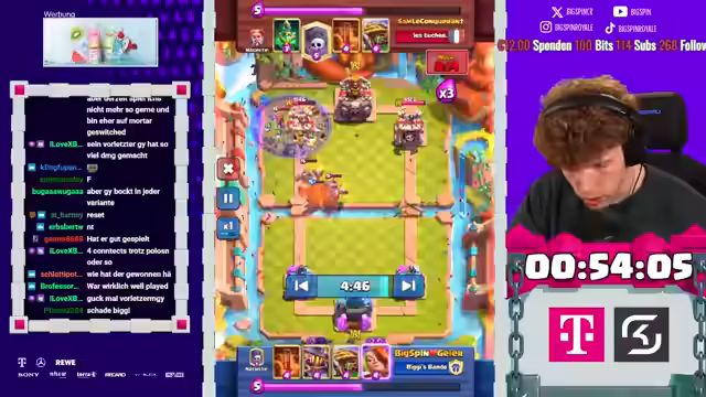 00:47:44Es wird über ein neues Deck von Big Spin diskutiert, das auf YouTube vorgestellt wurde. Es kombiniert Royal Giant mit Goblin Giant, wobei die Luftverteidigung schwach ist. Es folgt ein Spiel in der Grand Challenge, wo der Gegner Rage nutzt, was zu Problemen führt. Der Gegner spielt eine ungewöhnliche Kombination aus Ballon, Holzfäller und Walküre. Trotz anfänglicher Schwierigkeiten und eines Elixier-Nachteils gelingt es, sich einen Vorteil zu erarbeiten und den Gegner unter Druck zu setzen. Es wird eine riskante Strategie gewählt, bei der auf eine starke Verteidigung gesetzt wird, um dann mit einem Elixier-Vorsprung anzugreifen. Der Streamer äußert Frustration darüber, dass er zwar das gegnerische Deck versteht und perfekt kontert, aber dennoch oft frühzeitig in der Grand Challenge ausscheidet. Es wird überlegt, ob die Challenge zu schwer ist und ein neues Deck gedraftet werden soll.