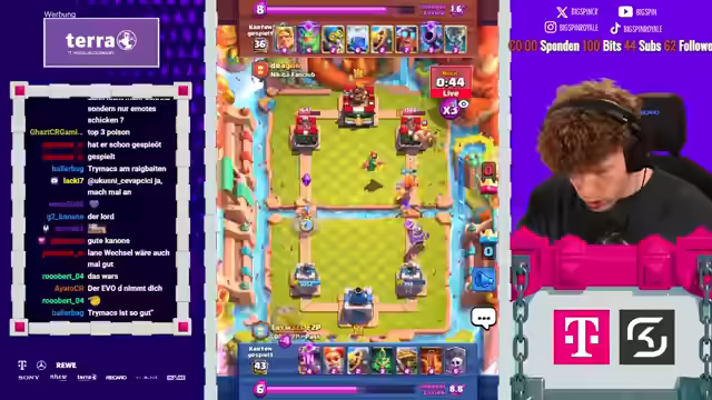 00:44:35Ich setze die Grand Challenge mit demselben Deck fort, bis ich wieder verliere. Mein nächster Gegner hat einen Cage, was für mich nicht gut ist. Er hat auch Dark Prince und E-Giant, gegen die ich Fischer und Zeppies im Angebot habe. Er hat auch Seppies, was stark gegen mich ist. Mein Deck ist immer noch schlecht. Ich mache gerne mal einen schlichten Backel. Ich habe auf einen Millimeter Schild noch reingecharged, was schön zu sehen war. Ich habe den Evo Cage und den Evo Sepp. Mein Gegner hat Mighty Miner. King Tower ist an, was mich nervt. King Tower an ist nicht gut, weil er auch Seppis und Icegeist hat. Es ist fraglich, ob ich das jetzt noch gewinnen kann. Ich bin jetzt nicht der größte Experte.