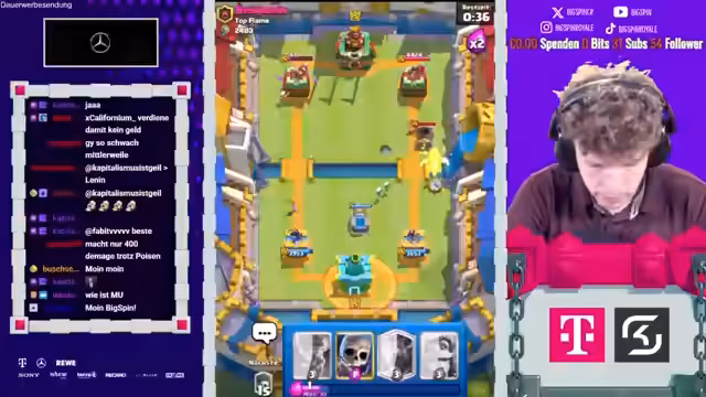 00:34:21Nach der technischen Lösung beginnt das Spiel gegen D. Gonzalo. Der Gegner startet mit einem direkten All-in-Angriff mit Prinz und Wache. Der Streamer agiert gelassen und nutzt seine Karten wie den Goblinischen Giganten und den Eiskristall, um den Angriff abzuwehren und den Turm des Gegners zu zerstören. Er nutzt die Gelegenheit, um den Turm des Gegners zu schwächen und den Sieg mit einer erfolgreichen Connection zu sichern, was erneut die Effektivität seines Spielstils unter Beweis stellt.